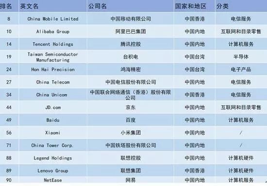 榜單顯示,有14家中國企業上榜,其中中國移動有限公司排名最高,排名第8位,阿里巴巴集團和騰訊控股分列第10位和第14位。