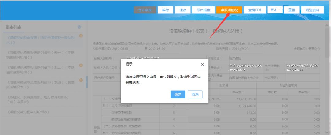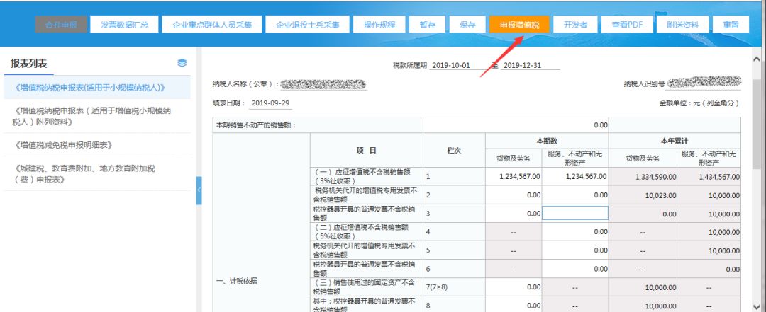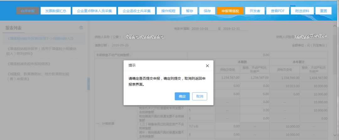(3)填寫完整增值稅小規(guī)模申報(bào)表后,點(diǎn)擊【申報(bào)增值稅】按鈕,系統(tǒng)僅提交增值稅申報(bào);