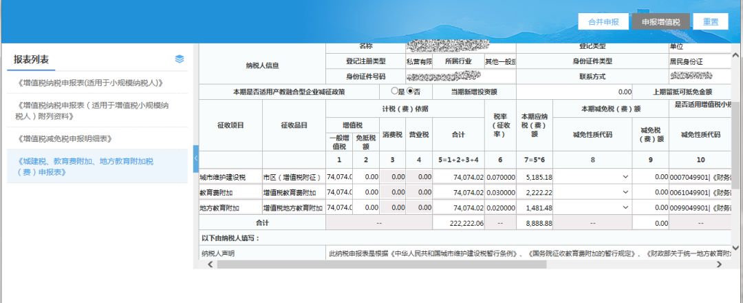 (6)檢查附加稅數(shù)據(jù),填寫完成相關(guān)數(shù)據(jù)項(xiàng)后,點(diǎn)擊【合并申報(bào)】按鈕,進(jìn)行合并申報(bào);