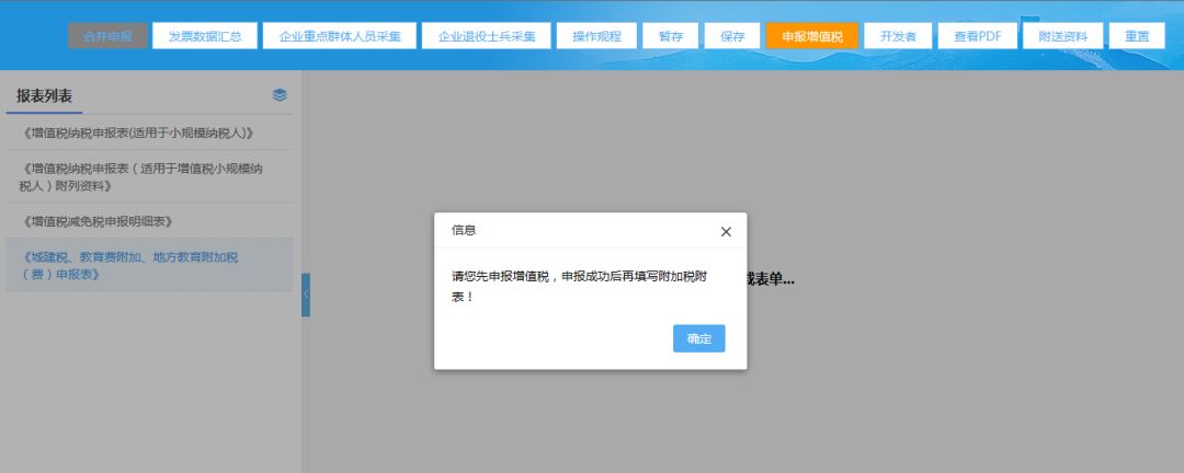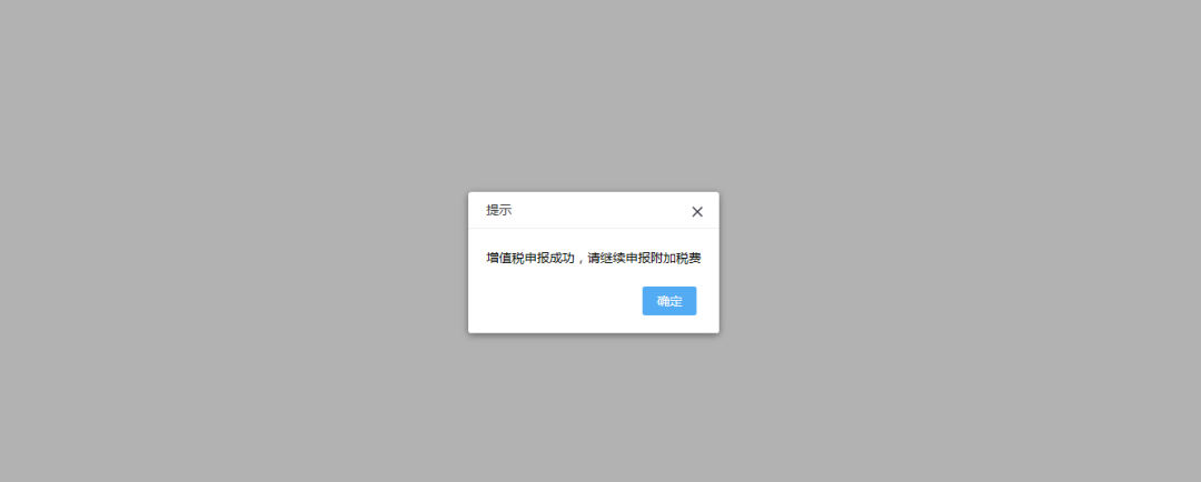(5)增值稅申報(bào)成功后,系統(tǒng)返回增值稅申報(bào)成功,點(diǎn)擊【確定】按鈕可進(jìn)行附加稅申報(bào);