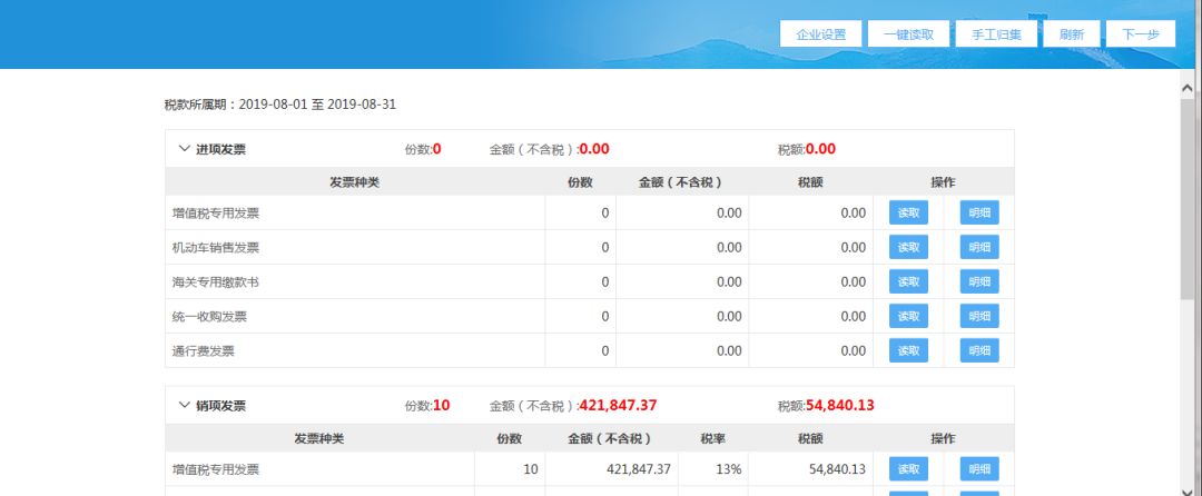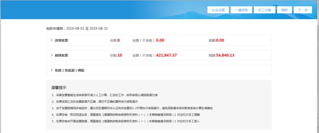 (2)進(jìn)入發(fā)票匯總界面后,系統(tǒng)自動(dòng)獲取當(dāng)期所有的進(jìn)銷項(xiàng)發(fā)票數(shù)據(jù);