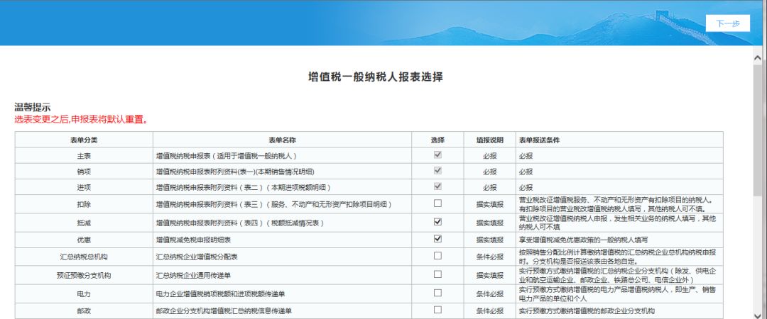 (3)發(fā)票匯總界面點(diǎn)擊“下一步”按鈕,系統(tǒng)進(jìn)入增值稅一般納稅人選表設(shè)置界面,企業(yè)根據(jù)自己實(shí)際業(yè)務(wù)發(fā)生情況勾選需報(bào)送的申報(bào)表,勾選完成點(diǎn)擊“下一步”進(jìn)入增值稅納稅申報(bào)表,如下圖: