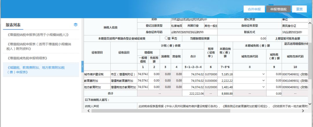 (5)檢查附加稅數(shù)據(jù),填寫完成相關(guān)數(shù)據(jù)項(xiàng)后,點(diǎn)擊【合并申報(bào)】按鈕,進(jìn)行合并申報(bào);