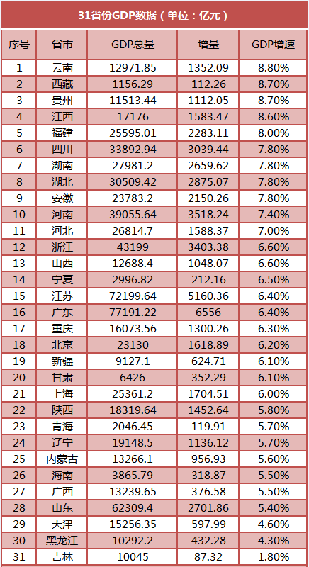 2019年前三季度,中國(guó)國(guó)內(nèi)生產(chǎn)總值697798億元,按可比價(jià)格計(jì)算,同比增長(zhǎng)6.2%。同全國(guó)水平相比,云南、貴州、西藏、江西、福建、四川、湖北、湖南、安徽、河南、河北、浙江、山西、寧夏、廣東、江蘇、重慶這17省份前三季度GDP增速跑贏全國(guó)。
