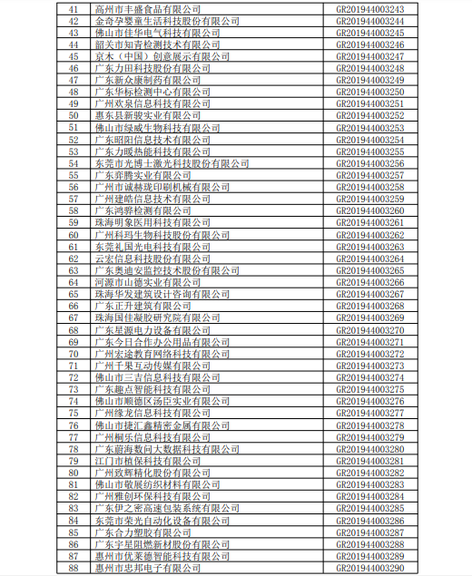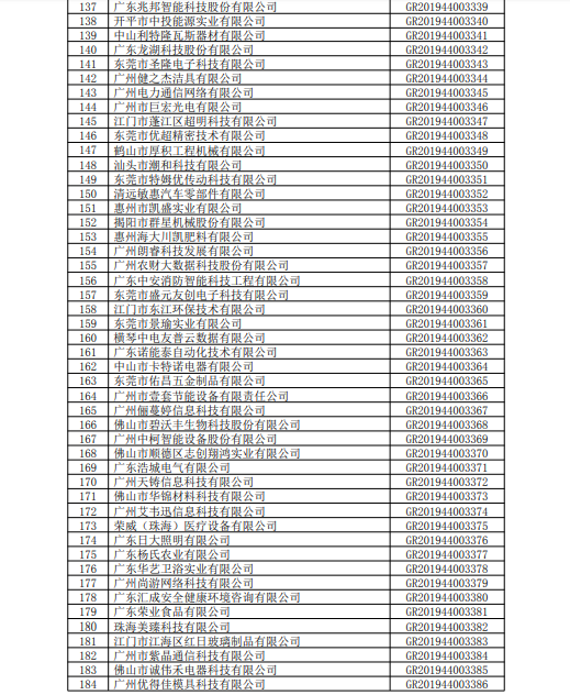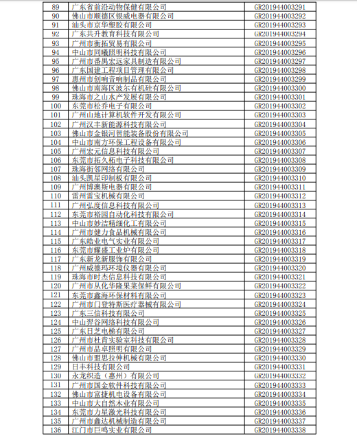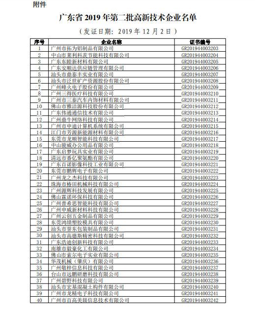 你們上報(bào)的《關(guān)于廣東省2019年高新技術(shù)企業(yè)認(rèn)定備案的函》(粵科函高字〔2019〕1730號(hào))收悉,F(xiàn)將公示無異議的廣州市拓為鋁制品有限公司等4090家企業(yè)予以高新技術(shù)企業(yè)備案。請(qǐng)你們按照《廣東省2019年第二批高新技術(shù)企業(yè)名單》(詳見附件)中的企業(yè)名稱、高新技術(shù)企業(yè)證書編號(hào)和發(fā)證日期打印并頒發(fā)“高新技術(shù)企業(yè)證書”。