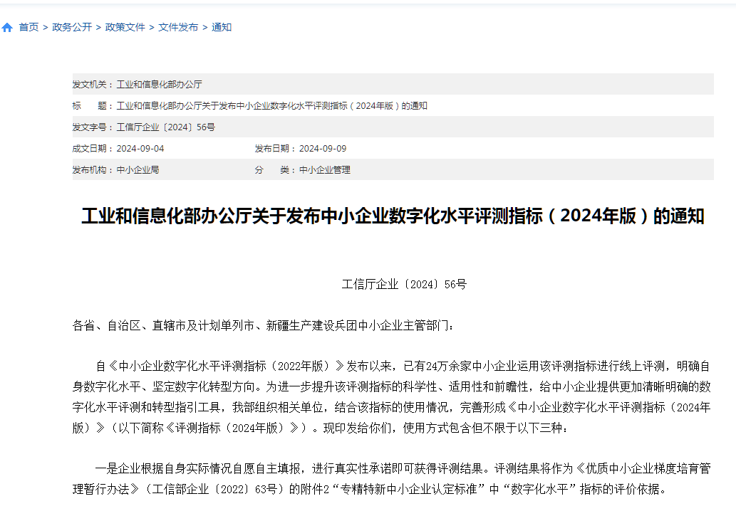 近日工業和信息化部辦公廳發布《中小企業數字化水平評測指標(2024年版)》,為中小企業提供更加清晰明確的數字化水平評測和轉型指引工具。鼓勵相關單位采用《中小企業數字化水平評測指標(2024 年版)》開展調查研究或運用評測結果;評測結果將作為《優質中小企業梯度培育管理暫行辦法》(工信部企業〔2022〕63號)的附件2“專精特新中小企業認定標準”中“數字化水平”指標的評價依據。